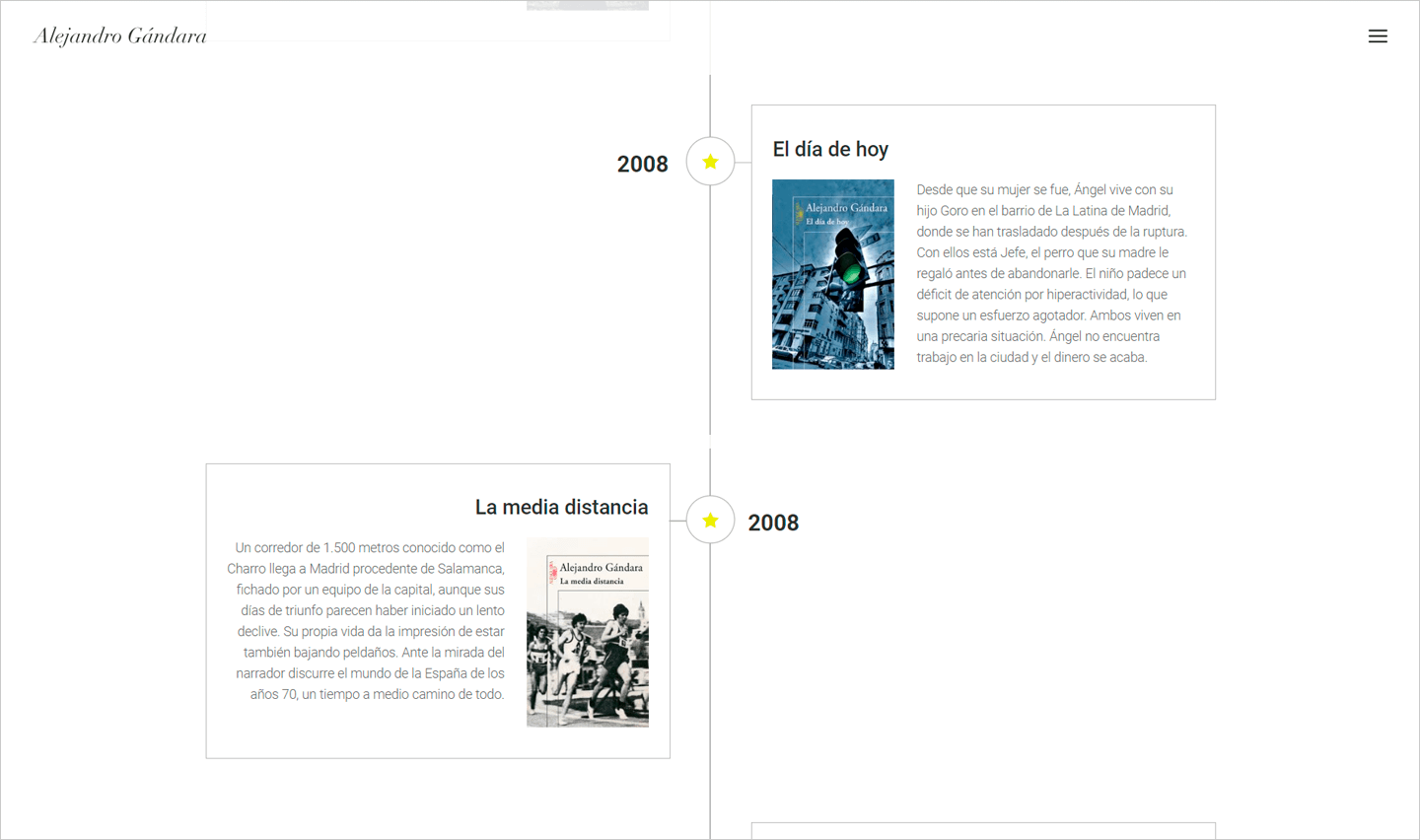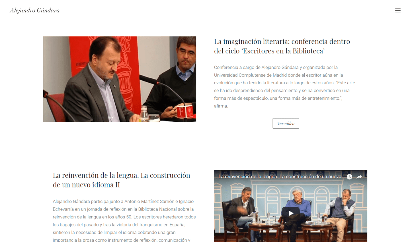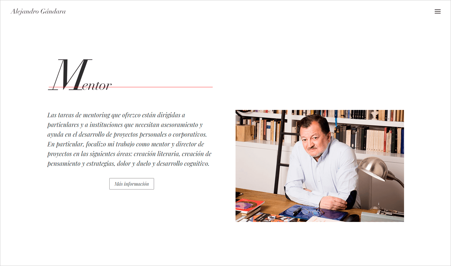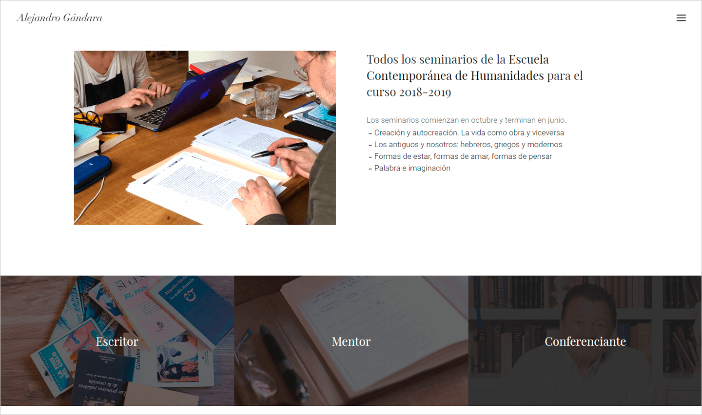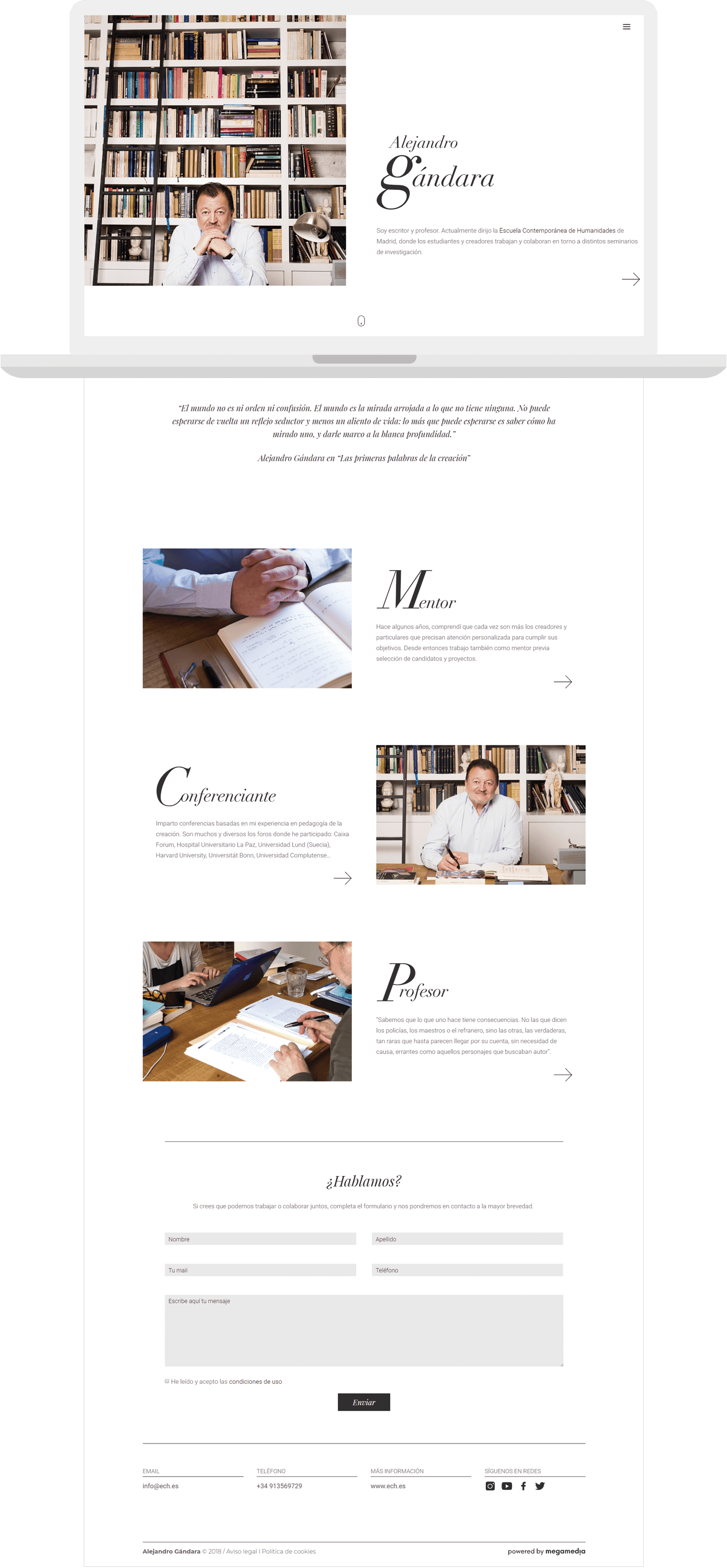 Escritor, profesor, periodista, conferenciante, director de la Escuela Contemporánea de Humanidades de Madrid... Alejandro Gándara es un humanista cántabro de reconocido prestigioso en el mundo literario español. Su página web nació de la necesidad de dotar a su dilatada trayectoria de una presencia digital acorde. Visualmente impoluta, elegante y clásica, los usuarios encuentran con facilidad ejemplos de sus trabajos y de los servicios que ofrece para jóvenes creadores.