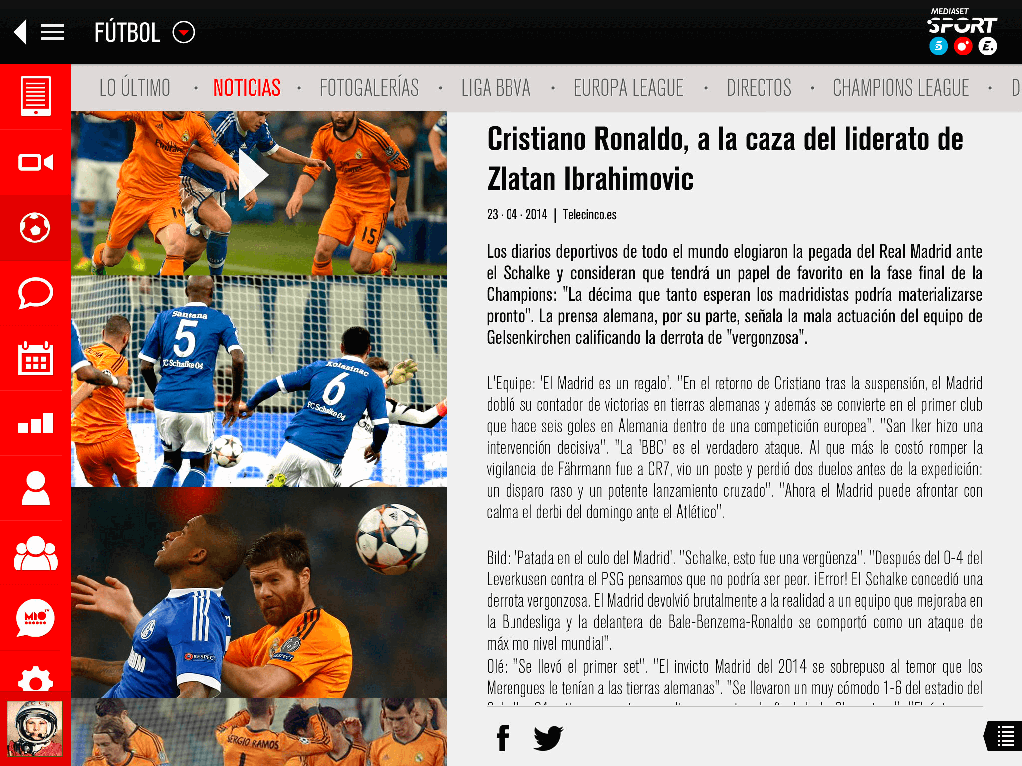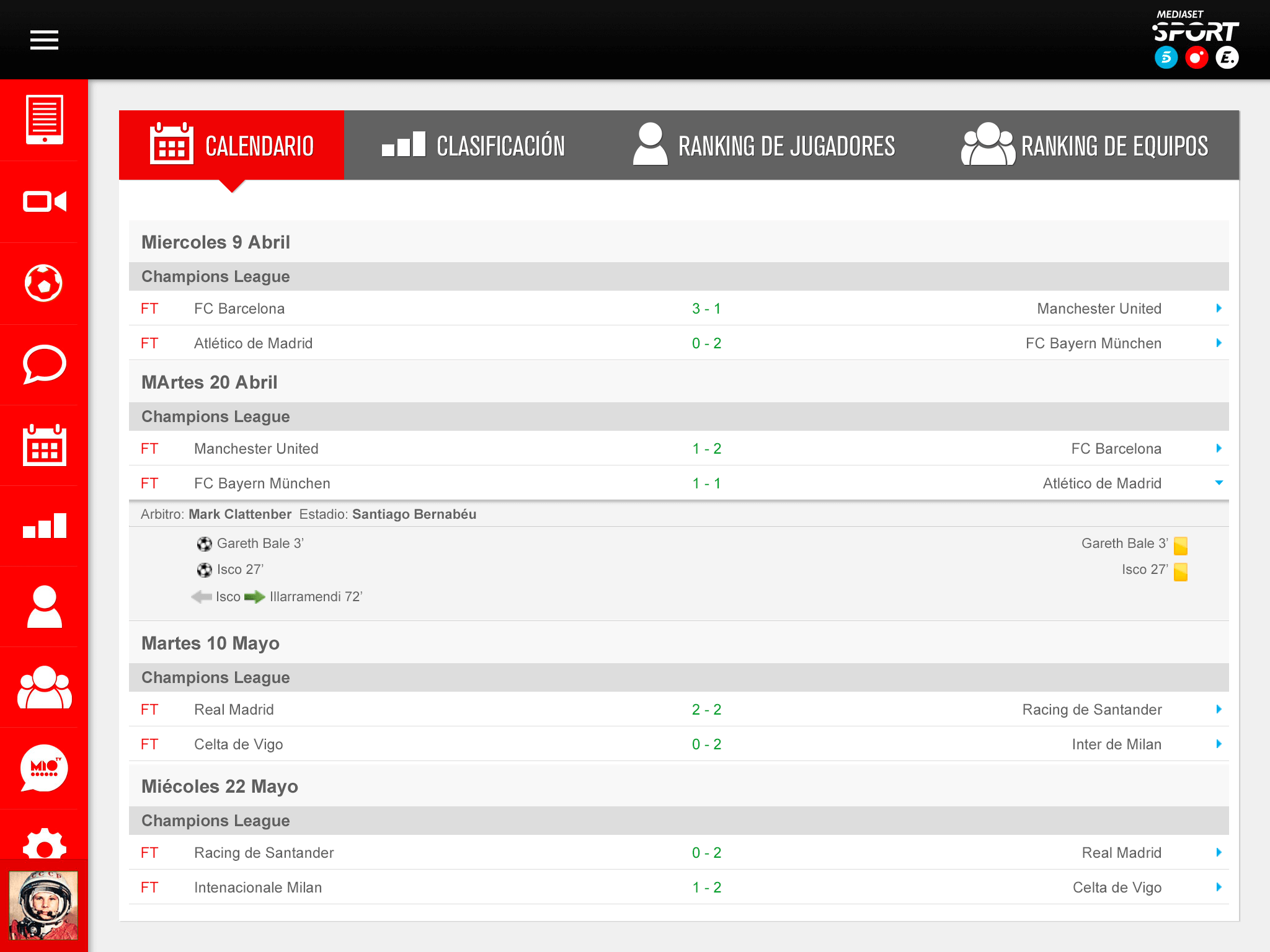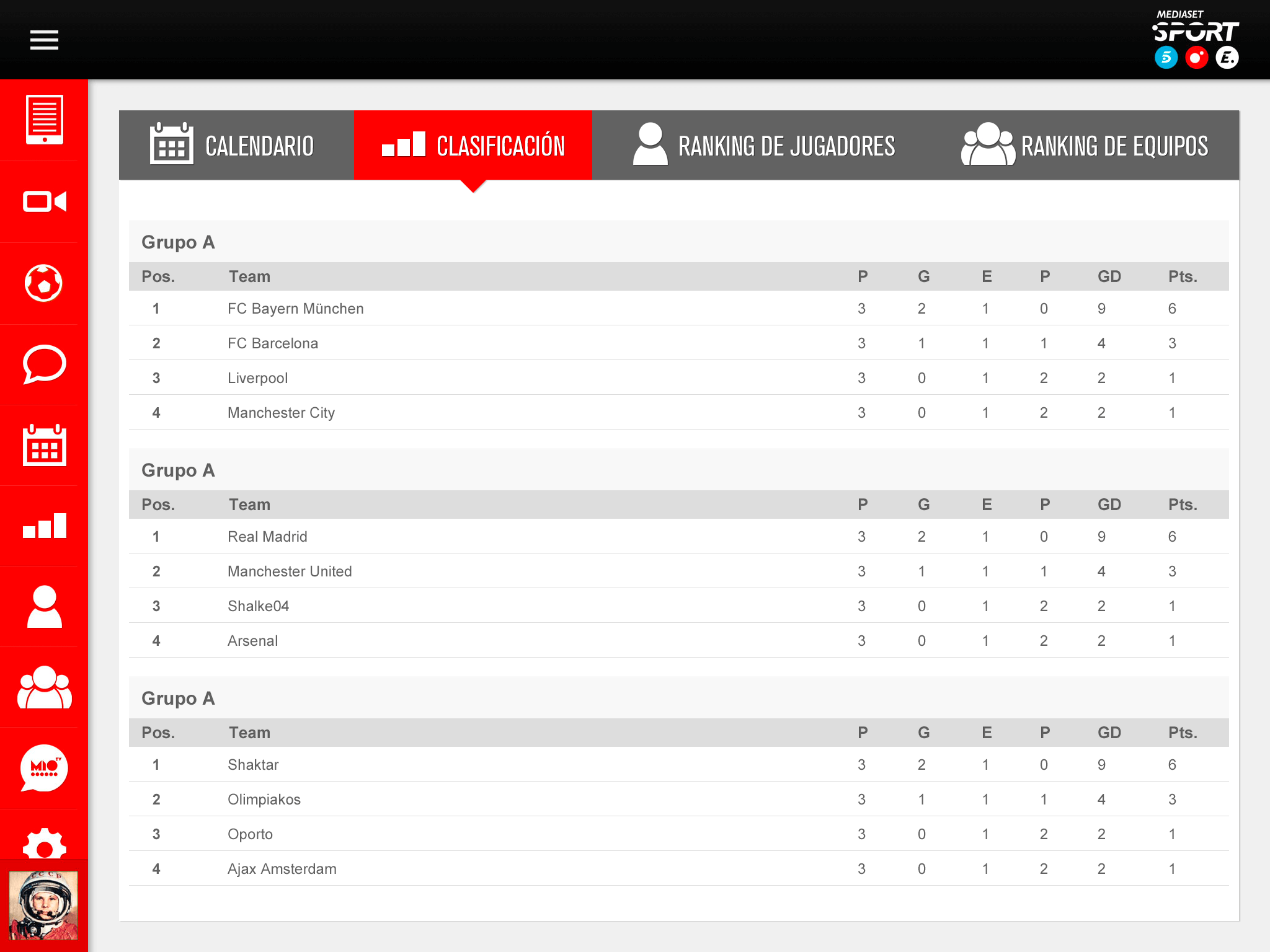 En la app de Mediaset Sport se encuentran todos los contenidos deportivos de los canales del grupo Mediaset (Telecinco, Cuatro, Energy y BeMad). Con información generalista de deportes, más el contenido exclusivo de las competiciones que retransmite Mediaset y los programas deportivos del grupo.