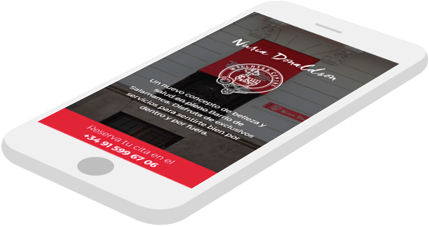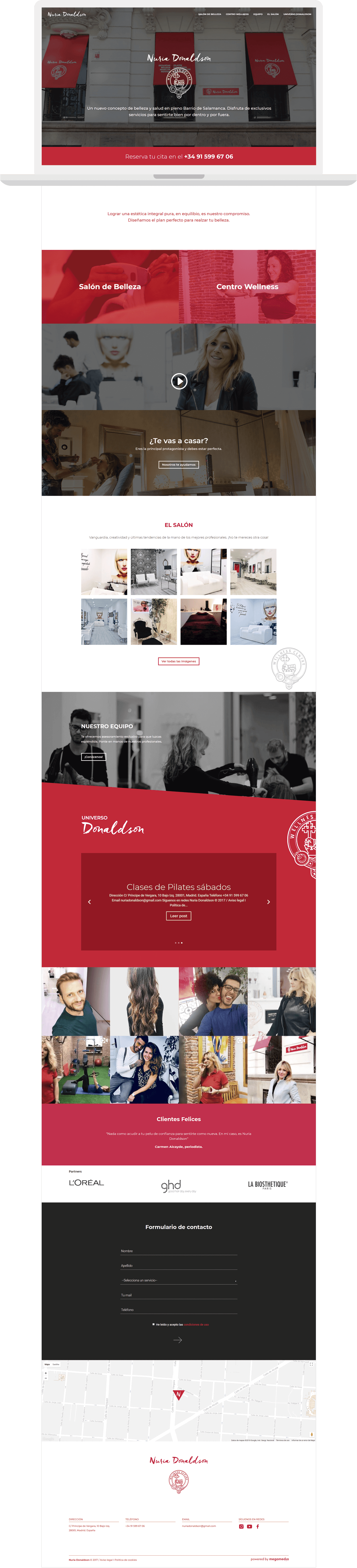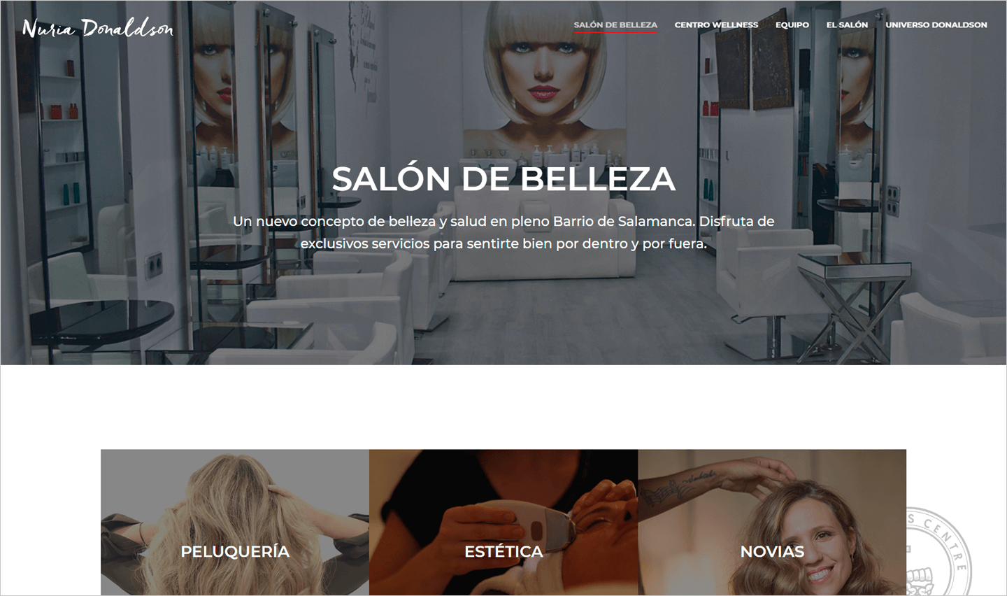 El Centro Wellness Nuria Donaldson está situado en el madrileño Barrio de Salamanca. Se trata de un novedoso concepto de belleza y salud que busca ofrecer una experiencia completa, reconfortante y rejuvenecedora, a sus clientes con una mezcla de centró de estética y gimnasio. El objetivo de la web fue adecuar la imagen digital a la idea que tenía la propietaria del comercio. Se buscó mezclar las áreas que conforman el local (salud y belleza) con un lado más social como la organización de eventos y la presencia de personajes famosos.