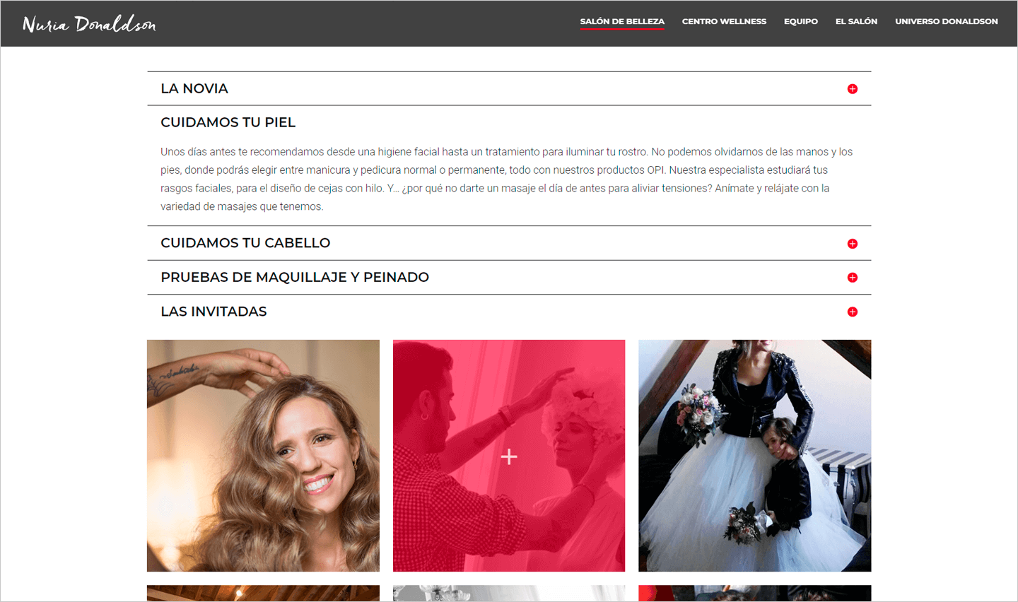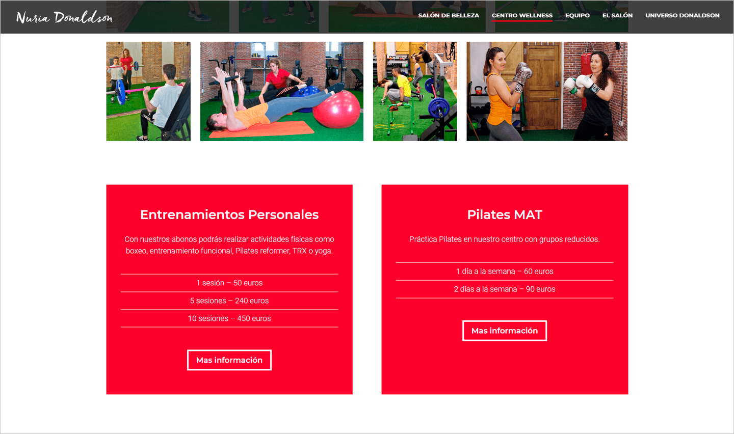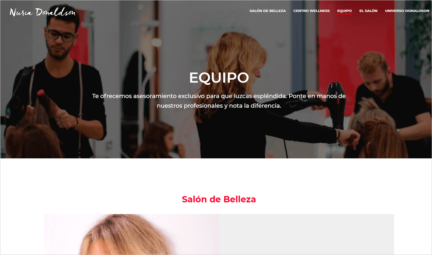 El Centro Wellness Nuria Donaldson está situado en el madrileño Barrio de Salamanca. Se trata de un novedoso concepto de belleza y salud que busca ofrecer una experiencia completa, reconfortante y rejuvenecedora, a sus clientes con una mezcla de centró de estética y gimnasio. El objetivo de la web fue adecuar la imagen digital a la idea que tenía la propietaria del comercio. Se buscó mezclar las áreas que conforman el local (salud y belleza) con un lado más social como la organización de eventos y la presencia de personajes famosos.